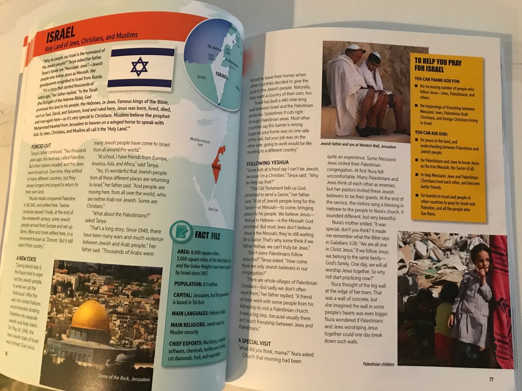called Window on the World: an Operation World Prayer Resource published by InterVarsity Press. It has gorgeous colorful photos and stories geared for kids 8-12. There is a creative 2-page spread to help us learn about 52 countries (of the world’s 230 countries) and 34 people groups who particularly need prayer. It includes very interesting facts and since we now are living near 3 grandkids in our new home, it has particularly helped our family become more familiar with countries we thought we knew. Such a good investment in your family, even as a gift. Our grandchildren like it a lot.