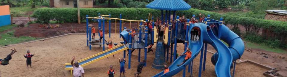 It is such a delight when God leads you to do something that you love to do. Spending 12 days with dear friends from the US visiting dear friends from Uganda was above and beyond a joy. For me it was wonderful to introduce my friends to Africa and to Robert and Sarah of Jinja, Uganda. My co-travelers were the donors of this beautiful playground, Betsy and Michael Riggan. The playground was installed while we were there at Fountain of Hope School. We and the children watched each day as this mysterious conglomeration of bright blue metal pipes and plastic cylinders turned into something they could play on. Robert told me he didn’t know what a “playground” meant when I first asked him if his school with 1300 kids could use one.